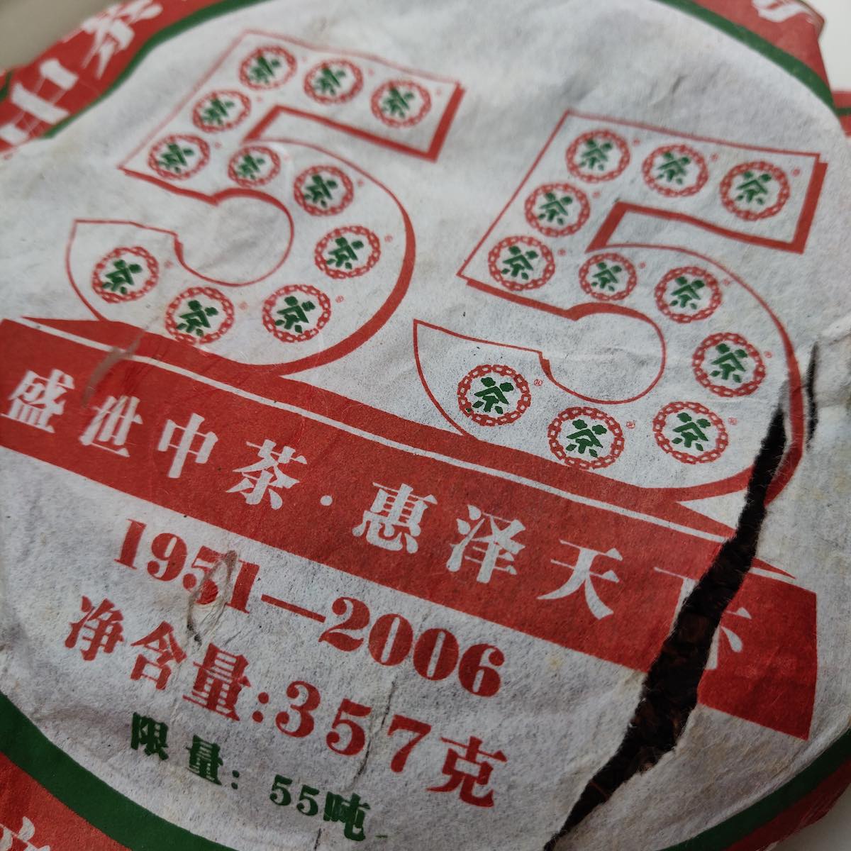The wrapper itself looks lovely with vibrant red and green colours as you can except from a CNNP cake. Instead of the large Chinese character ‘tea’ (茶) in the middle of the wrapper, this one displays the number ’55’ in the middle. The cake was pressed in 2006, in which the Zhongcha brand is celebrating its 55 years of existence! Hence, this cake was pressed to celebrate that important year.