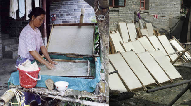 Every July and August raw materials are peeled from the paper mulberry tree bark with a knife. The strips are then dried in the sun and then cooked for 10 hours in a pan.